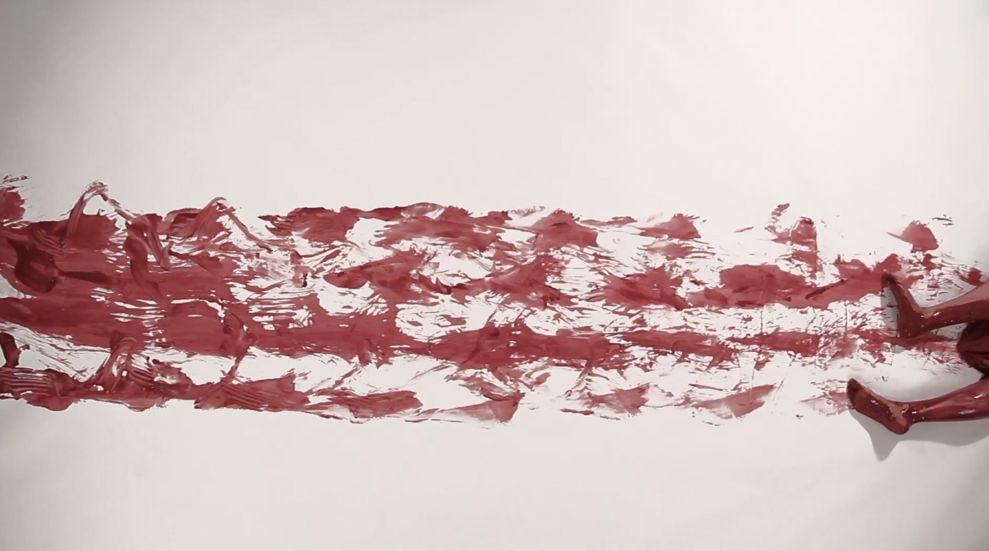 This is a direct one minute performance of the artist dipped in paint and crawling along a white paper.